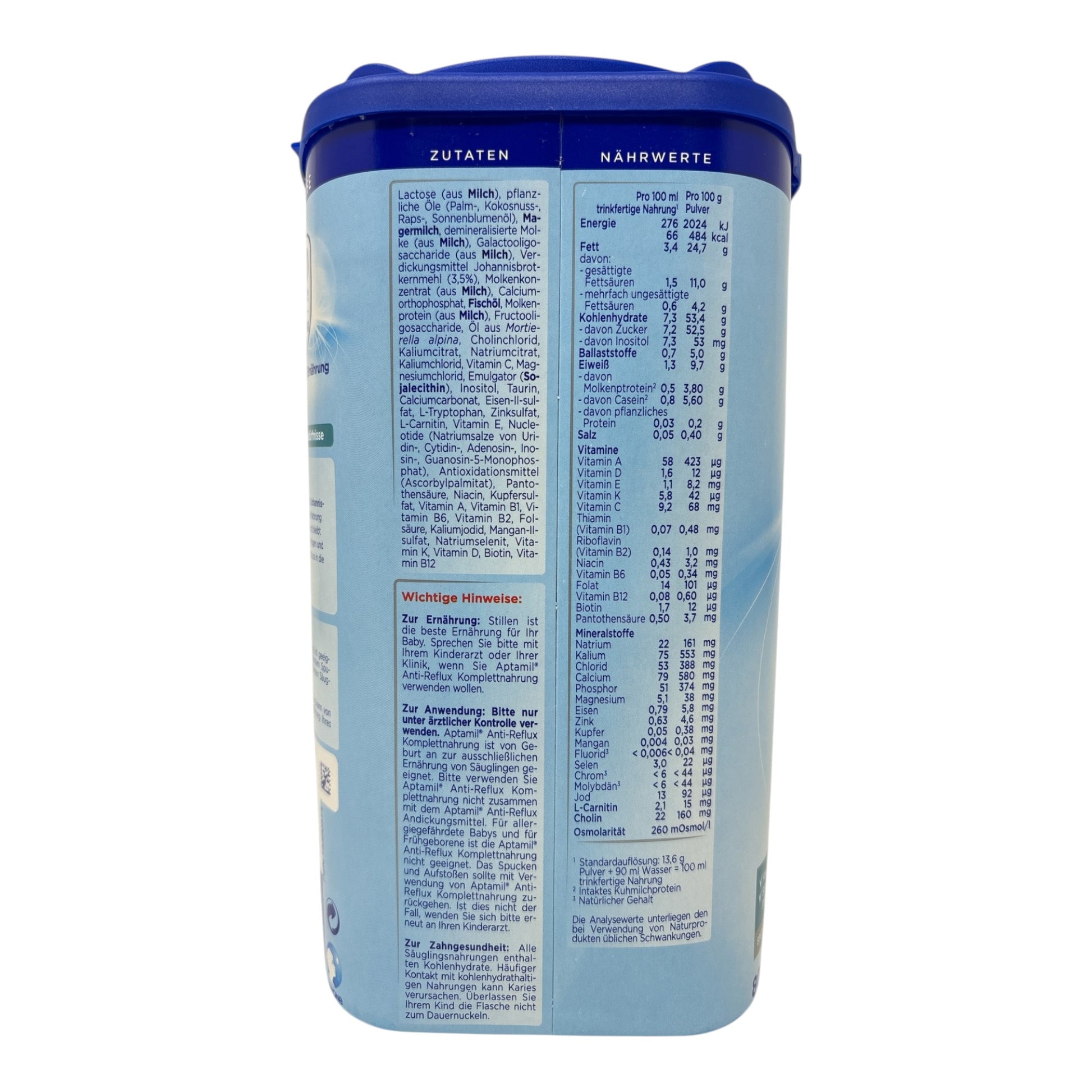 Lactose (aus MILCH), pflanzliche Öle (Palm-, Kokosnuss-, Raps-, Sonnenblumenöl), MAGERMILCH, demineralisierte Molke (aus MILCH), Galactooligosaccharide (aus MILCH), Verdickungsmittel Johannisbrotkernmehl (3,5%), Molkenkonzentrat (aus MILCH), Calciumorthophosphat, FISCHÖL, Molkenprotein (aus MILCH), Fructooligosaccharide, Öl aus Mortierella alpina, Cholincholrid, Kaliumcitrat, Natriumcitrat, Kaliumchlorid, Vitamin C, Mangnesiumchlorid, Emulgator (SOJALECITHIN), Inositol, Taurin, Calciumcarbonat, Eisen-II-sulfat, L-Tryptophan, Zinksulfat, L-Carnitin, Vitamin E, Nucleotide (Natriumsalze von Uridin-, Cytidin-, Adenosin-, Inosin-, Guanosin-5-Monophosphat), Antioxidationsmittel (Ascorbylpalmitat), Pantothensäure, Niacin, Kupfersulfat, Vitamin A, Vitamin B1, Vitamin B6, Vitamin B2, Folsäure, Kaliumjodid, Mangan-II-sulfat, Natriumselenit, Vitamin K, Vitamin D, Biotin, Vitamin B12.