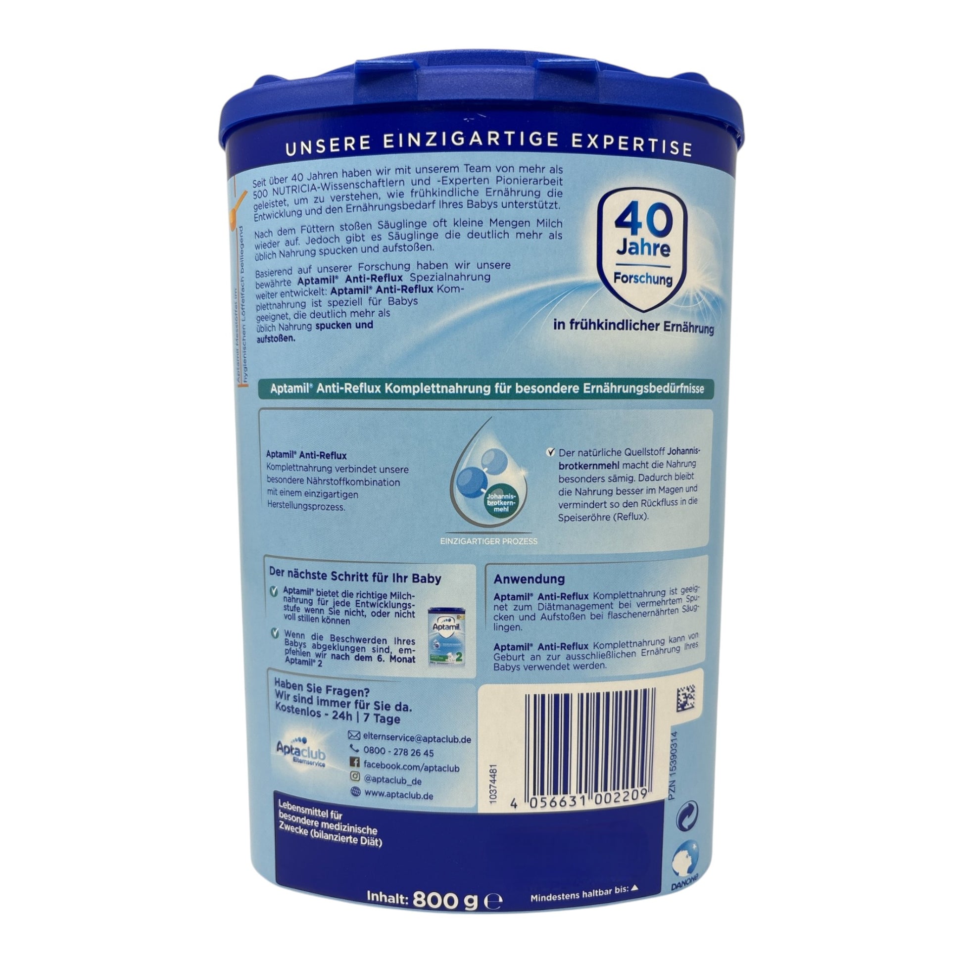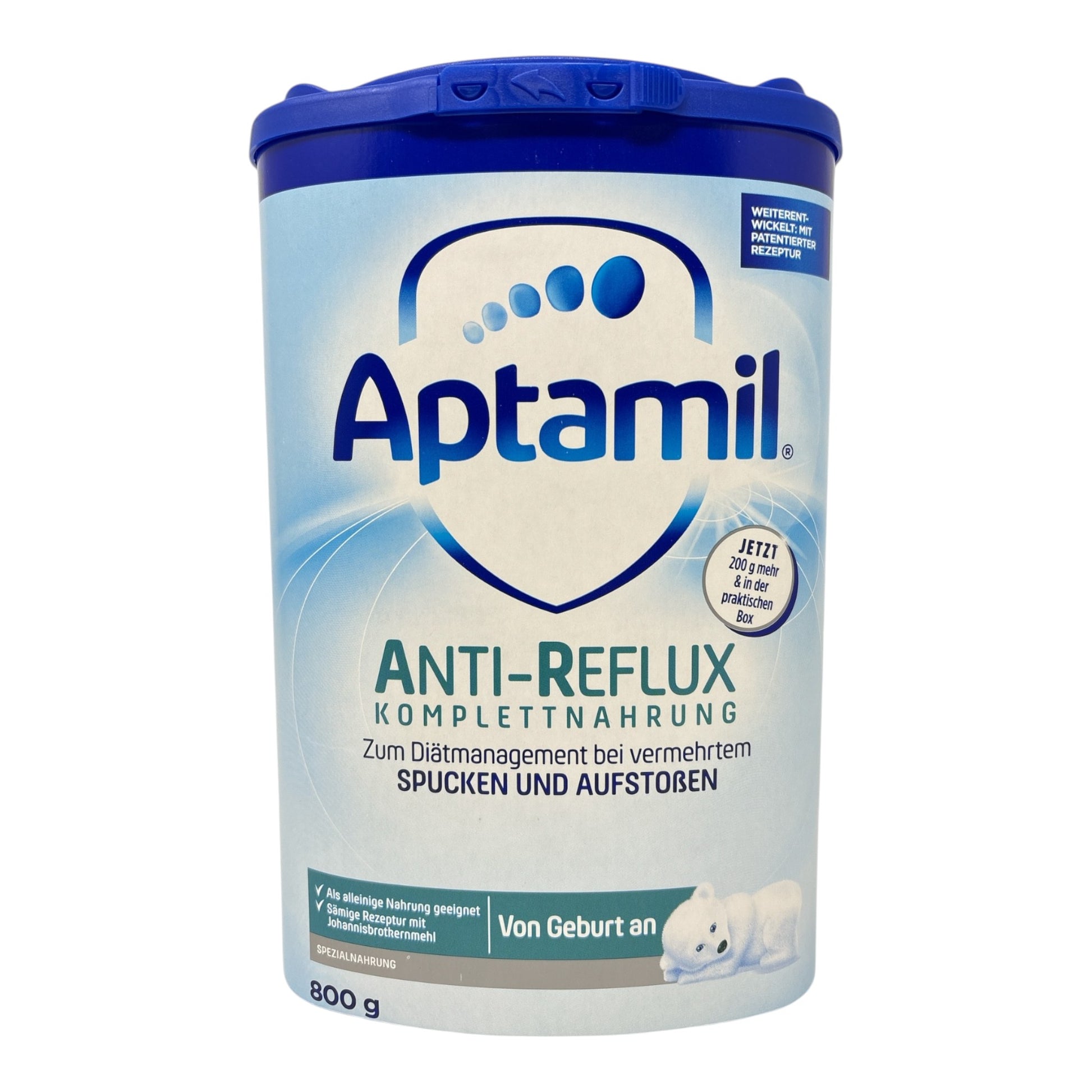 Nach dem Füttern stoßen Säuglinge oft kleine Mengen Milch wieder auf. Jedoch gibt es Säuglinge die deutlich mehr als üblich Nahrung spucken und aufstoßen. Basierend auf unserer Forschung haben wir unsere bewährte Aptamil® Anti-Reflux Spezialnahrung weiter entwickelt: Die Aptamil® Anti-Reflux Komplettnahrung ist speziell für Babys geeignet, die deutlich mehr als üblich Nahrung spucken und aufstoßen. Der natürliche Quellstoff Johannisbrotkernmehl macht die Nahrung besonders sämig. Dadurch bleibt die Nahrung besser im Magen und vermindert so den Rückfluss in die Speiseröhre (Reflux).