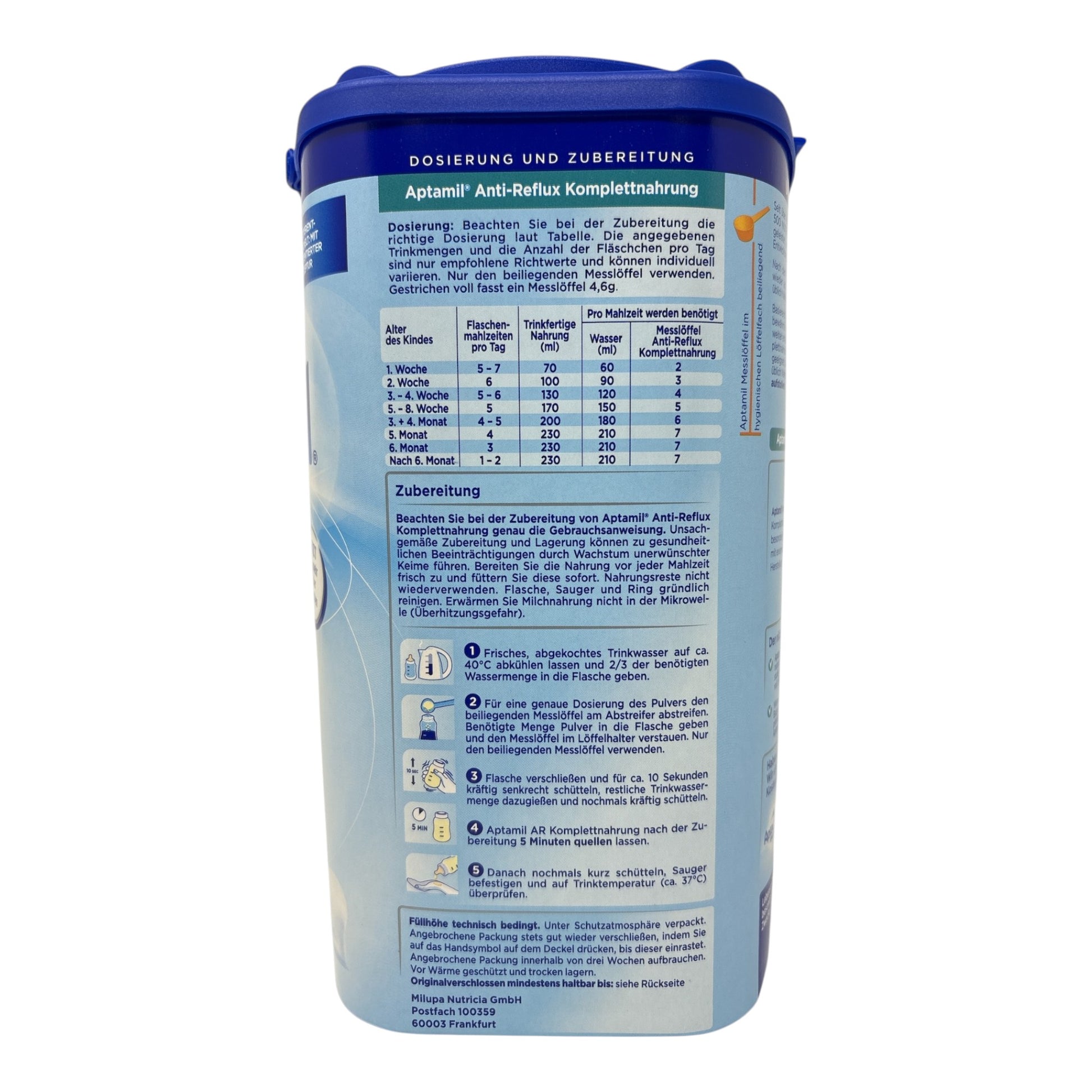 Beachten Sie bei der Zubereitung von Aptamil' Anti-Reflux Komplettnahrung genau die Gebrauchsanweisung. Unsachgemäße Zubereitung und Lagerung kann zu gesundheitlichen Beeinträchtigungen durch Wachstum unerwünschter Keime führen. Bereiten Sie die Nahrung vor jeder Mahlzeit frisch zu und füttern Sie diese sofort. Nahrungsreste nicht wiederverwenden. Flasche, Sauger und Ring gründlich reinigen. Erwärmen Sie die Milchnahrung nicht in der Mikrowelle (Überhitzungsgefahr). 1. Frisches, abgekochtes Trinkwasser auf ca. 40°C abkühlen lassen und 2/3 der benötigten Wassermenge in die Flasche geben. 2. Für eine genaue Dosierung des Pulvers den beiliegenden Messlöffel am Abstreifer abstreifen. Benötigte Menge Pulver in die Flasche geben und den Messlöffel im Löffelhalter verstauen. Nur den beiliegenden Messlöffel verwenden.3. Flasche verschließen und für ca. 10 Sekunden kräftig senkrecht schütteln, restliche Trinkwassermenge dazugießen und nochmals kräftig schütteln. 4. Aptamil AR Komplettnahrung nach der Zubereitung 5 Minuten quellen lassen. 5. Danach nochmals kurz schütteln, Sauger befestigen und auf Trinktemperatur (ca. 37°C) überprüfen.