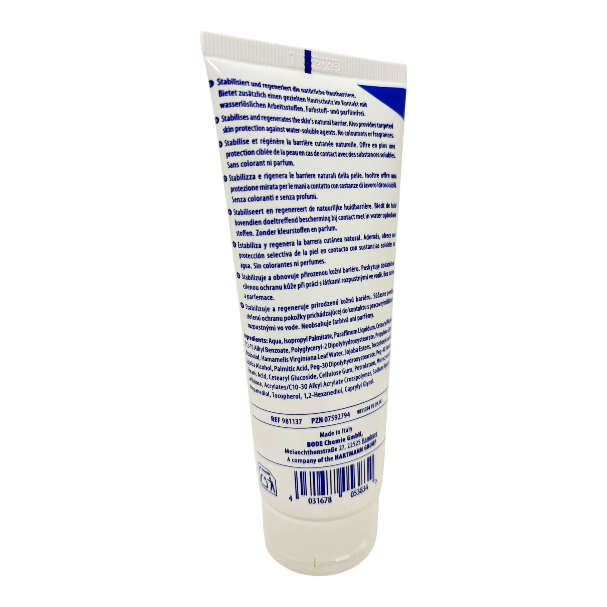 Lotion zum Schutz vor wässrigen Lösungen und regenerierende Pflege für rissige und stark beanspruchte Haut.